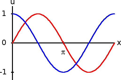 Graf sinusne funkcije u = sin x (rdeča črta) in kosinusne