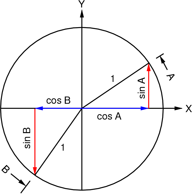 To sta izreka o sinusu in kosinusu vsote dveh kotov. Kot poseben primer A = B vsebujeta tudi oba izreka o dvojnem kotu.