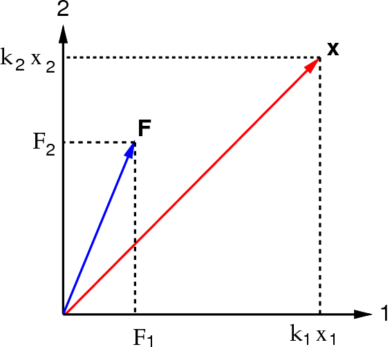 Povezava med dvema vektorjema v naravi poteka dostikrat v kosu snovi. Dober primer je atom v kristalu, ki je na okolišnje atome privezan s tremi "vzmetmi" v treh pravokotnih smereh. Če deluje na atom zunanja sila F vzdolž kakšne vzmeti, se atom premakne v smeri sile za premik x. Za majhne sile velja F = kx. Če pa deluje sila poševno in vzmeti niso enako močne, nastali premik ni več vzporeden s silo. Za majhne sile velja F = k · x. Vektor sile torej ustvarja na atomu vektor premika. Lahko tudi rečemo, da atom preslikuje vhodni vektor (silo) v izhodni vektor (premik). V nekaterih snoveh je izhodni vektor zmeraj vzporeden z vhodnim vektorjem, ne glede na to, kako je slednji usmerjen. V drugih snoveh pa je bolj ali manj poševen. Le vzdolž nekaterih smeri je usmerjen kolinearno. Atom in njegove vezi s sosedi v snovi torej določajo, kje potekajo te osi. To so glavne osi preslikave. Če kos snovi obračamo, se z njim obračajo tudi glavne osi.