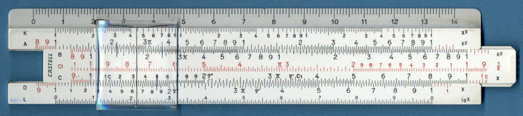 Slika 13.2 Drsno računalo. Osnovni skali sta D in drseči C. Računalo kaže produkt 1,24 · 1,32 = 1,64. Hkrati kaže kvocient 1,64/1,32 = 1,24. Skala A je kvadrat skale D in kaže 1,642 = 2,7 oziroma √2,7 = 1,64. Podobno velja za skalo K, ki je kub skale D. Skala L pa je logaritem skale D in kaže lg 1,64 = 0,215. (Anon)