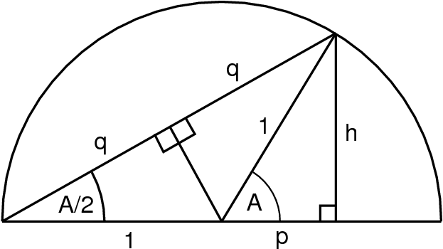 Slika pove: cos A = p; cos A/2 = q; in cos A/2 = (1 + p)/2q. Pa še tole: sin A = h in sin A/2 = h/2q. Iz prve enačbe izrazimo p, iz druge q in oba vstavimo v tretjo enačbo. Nato pa q iz druge enačbe in h iz četrte vstavimo še v peto enačbo. Preimenujemo A/2 in A v A in 2A ter dobimo: