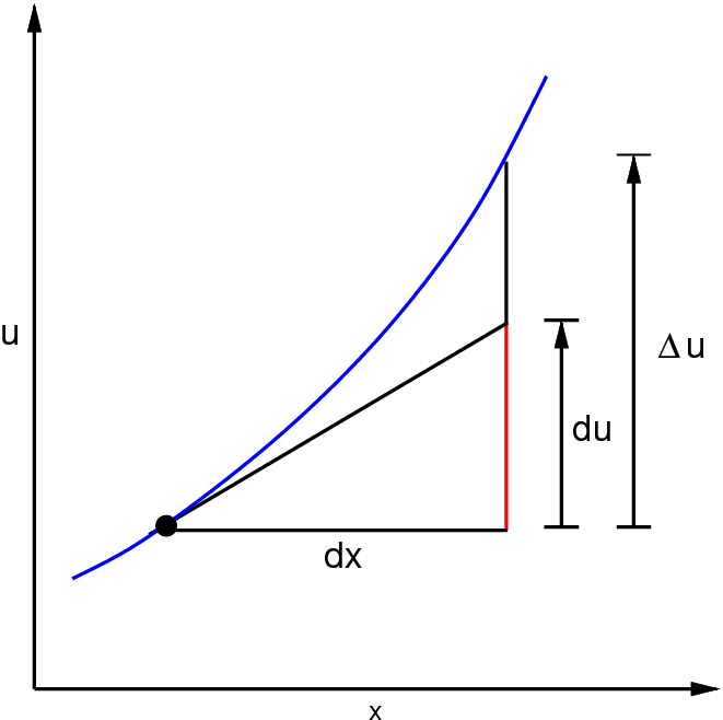 Pri spremembi neodvisne spremenljivke za dx se funkcija spremeni za Δu = u(x + dx) − u(x). Ustrezni navpični prirastek na tangenti poimenujemo diferencial du funkcije in znaša
