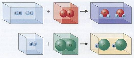 Pri plinih lahko poleg mas merimo tudi prostornine. Morda velja tudi zakon o stalnih prostorninskih razmerjih? — Pri temperaturi nad vreliščem vode zmešamo 1 l vodika in 1 l kisika ter ju prižgemo z žarečo žico. Nastane 1,5 l plina, ki vsebuje vodno paro. V porozno oglje vpijemo vodno paro, preostane 0,5 l kisika. Torej se 1 l vodika spoji z 0,5 l kisika v 1 l vodne pare. Vodik, kisik in vodna para so v prostorninskem razmerju 2:1:2.