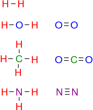 Pogled na molekulske formule pokaže, da se atomi povezujejo, kot da bi imeli eno, dve ali več "rok". Vodik ima, po definiciji, eno roko. S kisikom se spajata dva vodika; ima torej dve roki. Podobno ima dušik tri roke in ogljik štiri. Štiriročni ogljik lahko veže štiri enoročne vodike ali dva dvoročna kisika.