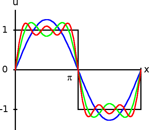 Integrale f(t) cos nωt in f(t) sin nωt preko cele periode razdelimo na dva dela: preko prve polovice in preko druge polovice, jih zlahka integriramo in dobimo f(t) = (4/π) [(1/1) sin ωt + (1/3) sin 3ωt + (1/5) sin 5ωt + …]. Funkcija je liha in je zato sestavljena iz samih sinusov.