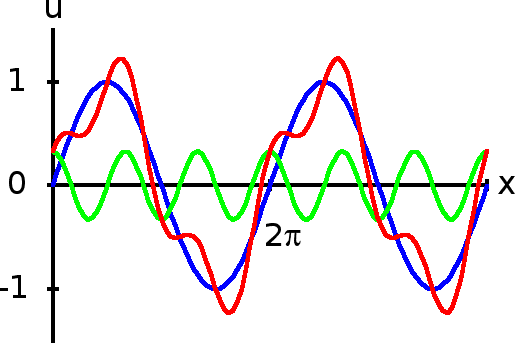 Vsota dveh sinusoid. Modra je sin x, zelena je