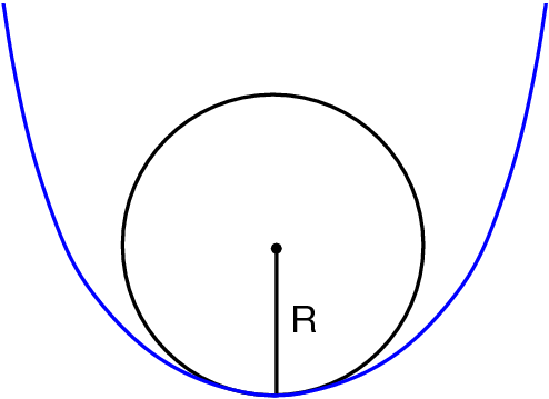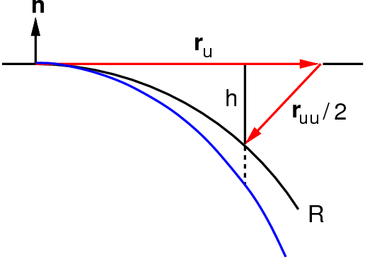 Ukrivljenost ploskve je enaka ukrivljenosti pritisnjenega kroga: dh = ds2/2R, torej 1/R = 2dh/ds2, zato: