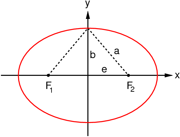 Koordinatni križ postavimo v središče elipse in ga zavrtimo tako, da njegove osi sovpadajo z veliko in malo osjo. Levo gorišče ima potem koordinato (−e, 0) in desno (+e, 0). Razdalji od gorišč do izbrane točke na elipsi znašata r12 = (x + e)2 + y2 in r22 = (x − e)2 + y2. Njuna vsota mora biti r1 + r2 = 2a in iz tega pogoja sledi, z nekaj računanja, enačba
