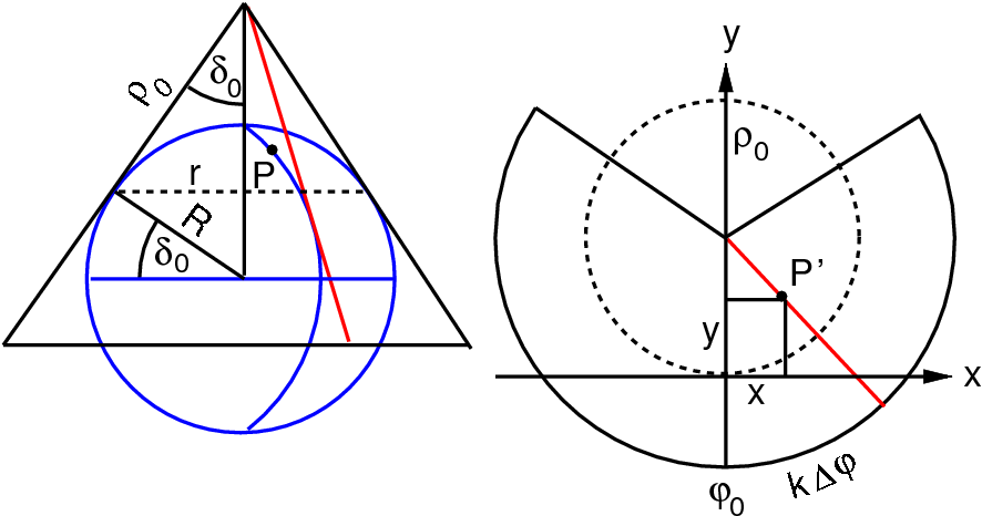 Naj se stožec dotika vzporednika δ0 = π/2 − θ0, ki je za ρ0 oddaljen od vrha stožca. Vrhnji polkot stožca je potem tudi enak δ0. Obseg stožca po tem vzporedniku znaša L1 = 2π ρ0 sin δ0. Ko plašč stožca razvijemo v ravnino, nastane izsekan krog, katerega celotni obseg je L2 = 2π ρ0. Razmerje teh dveh obsegov L1 / L2 = k = sin δ0. (Spomnimo se na stožčaste šotore, tipije, prerijskih severnoameriških domorodcev! Plašč tipija je točno polovica kroga: k = 1/2. To pomeni, da ima vrhnji polkot δ0 = 30°.)