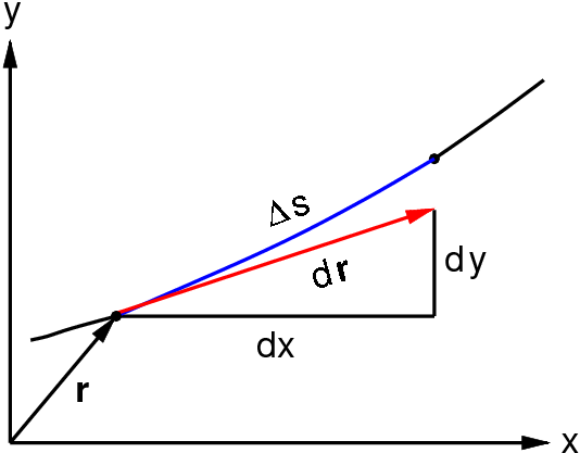 Prirast parametra za dt se odraža kot sprememba vektorja dr = (dx, dy) oziroma kot kratek kos krivulje, ločni element ds2 = dx2 + dy2.