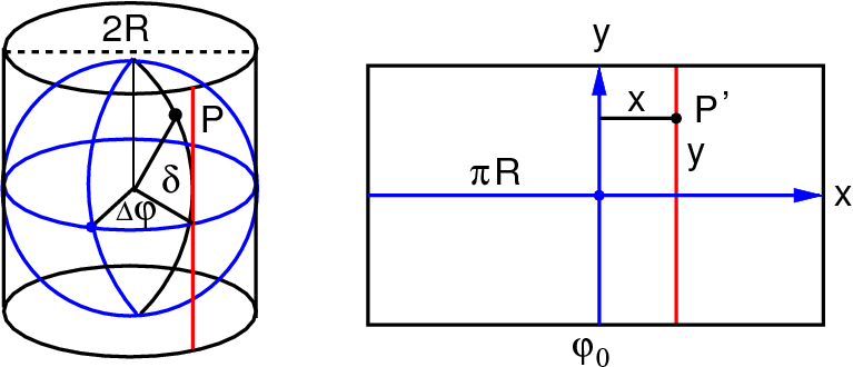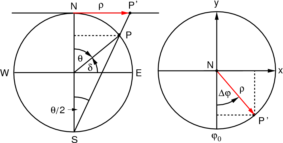 Za radij Zemlje izberemo primerno pomanjšano vrednost: R = M · RE, na primer M = 1:107. Namesto polarnega kota θ lahko uporabimo tudi zemljepisni kot δ = 90° − θ. V tangentni ravnini vpeljemo koordinatni sistem z izhodiščem v polu; os y kaže vzdolž poljubnega poldnevnika φ0. Potem velja
