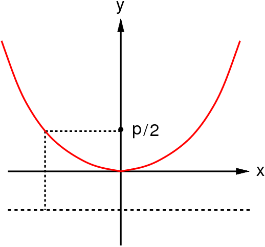 Postavimo koordinatni sistem tako, da bo premica "vodilja" vodoravna pri koordinati (0, −p/2). Gorišče je potem v točki (0, +p/2). Razdalja poljubne točke na iskani krivulji od gorišča je r12 = (y − p/2)2 + x2 in razdalja te točke od premice je r2 = |y + p/2|. Iz pogoja r1 = r2 sledi, z nekaj računanja,