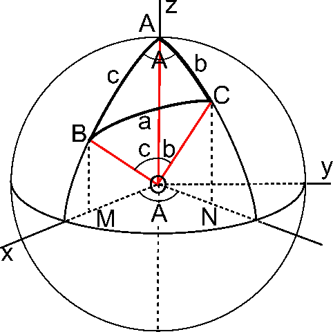 Na tri oglišča trikotnika kažejo vektorji OA, OB in OC. Koordinatni sistem usmerimo, kot kaže slika. V njem velja OA = (0, 0, 1) in OB = (sin c, 0, cos c). Vektor OC se projicira v ON pod kotom A, torej OC = (sin b cos A, sin b sin A, cos b). Skalarni produkt OB · OC = cos a. Zmnožimo komponente in dobimo:
