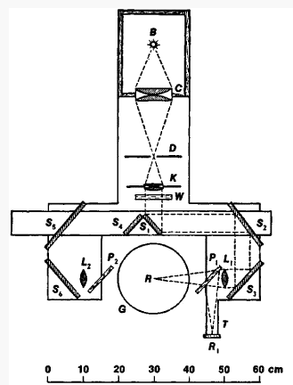 Osnovna zamisel meritve je naslednja. Iz žarnice sevamo enobarven curek svetlobe in ga s polprepustnim zrcalom razcepimo na dva delna curka, ki sta medsebojno pravokotna. Ta dva curka spustimo preko dveh krakov in ju z zrcali spet združimo v smeri, kjer ju opazujemo z daljnogledom. To je križni interferometer. Število svetlobnih valov vzdolž obeh razdalj v splošnem ni enako in je odvisno od razlike dolžin krakov ter od razlike hitrosti svetlobe v njih. Če bi bil izhodni curek popolnoma vzporeden, bi bilo vidno polje enakomerno osvetljeno ter bolj ali manj svetlo. Toda curek vsebuje tudi valovanje z nekoliko drugačnimi nagibi, zato se pojavijo v sredini vidnega polja interferenčni kolobarji.