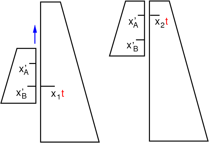 V neki točki na osi x nenadoma zagledamo vesoljsko ladjo. To je dogodek A. Na lokalni tabli in uri vidimo njegovo lego xA in čas tA. Nekaj kasneje vidimo ladjo v drugi točki na osi x. To je dogodek B. Na lokalni tabli vidimo njegovo lego xB in čas tB. Kakšna je hitrost ladje? Definiramo:
