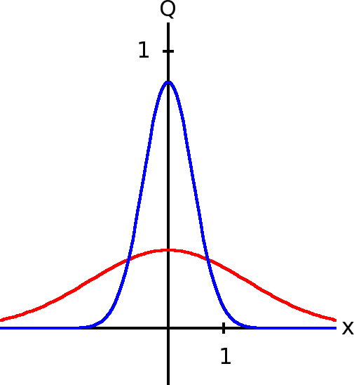 Naj bo prostor za difuzijo neomejen. Najpreprostejši začetni profil gostote je oster vrh pri x = 0. Gibanje delca primesi po ozadju molekul spominja na kotaljenje kroglice po ožlebljeni deski [33.6]. Porazdelitev kroglic po odmiku od središčne lege je normalna. Domnevamo, da je tako tudi pri difuziji delcev primesi: okrog začetne lege se bodo razpršili normalno in ta razpršitev se bo sčasoma širila in nižala. Zato izberemo nastavek ρ = 1/√(2πa) · exp (−x2/2a), pri čemer je a neznana funkcija časa. Vstavimo ga v difuzijsko enačbo in ugotovimo, da ji zadošča, ako a = 2Dt. To torej pomeni, da je rešitev