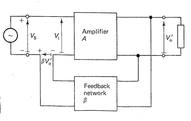 Slika 40.17 Ojačevalec s povratno vezjo. Del izhodnega signala se vodi nazaj na vhod skozi povratno vezje, recimo skozi uporovni delilnik. Tam se zaporedno pridruži siceršnjemu vhodnemu signalu. (Meadows, 1978)