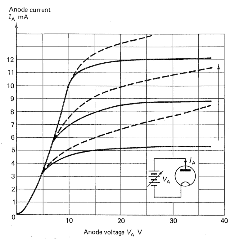 Slika 40.2 Karakteristika diode. Prikazan je tok skozi tipično diodo v odvisnosti od anodne napetosti glede na katodo pri različnih temperaturah žarilne nitke. Pri višjih temperaturah je nasičeni tok večji. Neposredno segrevana (polna) in posredno segrevana (črtasta) nitka. (Meadows, 1978)