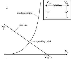 Karakteristika pove, kakšen je tok I skozi diodo, ko med njenima priključkoma vlada napetost UD, torej f(UD) (1). Če z baterijo UDD poganjamo tok skozi zaporedno zvezana upornik R in diodo, pa napetost med priključkoma diode ni enaka napetosti med priključkoma baterije, ker nekaj napetosti vlada tudi med priključkoma upornika. Vsota padcev napetosti po krogotoku je enaka gonilni napetosti UDD = IR + UD, torej UD = UDD − IR oziroma I = (UDD − UD)/R (2). Enačbi (1) in (2) za dve neznanki UD in I rešimo grafično. Enačba (2) je namreč delovna premica, ki seka ordinato pri UDD/R in absciso pri UD = UDD. Njeno presečišče z narisano f(UD) pove napetost na diodi in tok skoznjo, to je njeno delovno točko.