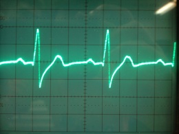 Srčni tok na zaslonu osciloskopa. Vidna sta dva srčna utripa