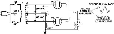 Slika 40.5 Polni diodni usmernik. Gretje diod ni prikazano. Izglajevalni kondenzator, vzporeden izhodnemu uporniku, ni narisan. (NEETS)