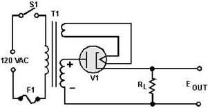 Slika 40.4 Polovični diodni usmernik. Gretje diode in napetost na njej zagotavlja vhodni transformator. Izglajevalni kondenzator, vzporeden izhodnemu uporniku RL, ni narisan. (Schure, A.)