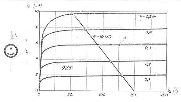 Delovno premico in delovno točko fotodiode izberemo po že znanem postopku. Na sliki je prikazan primer, ko sta dioda in zaporedni upornik 10 MΩ priključena na napetost 150 V. V temi ni toka in napetost na diodi znaša 150 V. Pri osvetlitvi 0,1 lumna steče tok 2 μA in napetost na diodi pade na 130 V. Linearna odvisnost toka od osvetlitve velja vse do osvetlitve 0,5 lm, ko doseže tok 10 μA in pade napetost na diodi na 50 V.