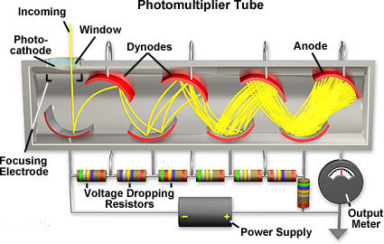 Slika 40.8 Fotopomnoževalka. Iz katode izbiti elektroni se pospešujejo proti zaporednim dinodam in iz njih izbijajo sekundarne elektrone. Nastane plaz elektronov. (Florida State University)