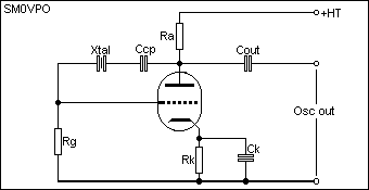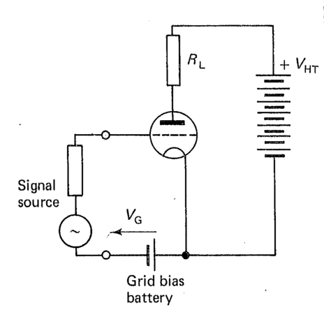 Slika 40.19 Triodni oscilator – triodni ojačevalec z nihajnim krogom na izhodu in v pozitivni povratni vezi. Za negativno napetost mrežice glede na katodo poskrbita CG in RG. Podobno vezje je prvi sestavil E. Armstrong. (Meadows, 1978)