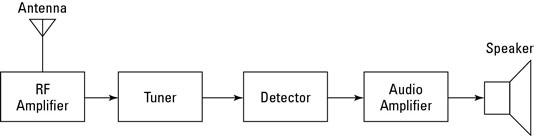 Slika 40.32 Televizijski sprejemnik. Sprejemnik razcepi televizijski signal na video in avdio signal ter prvega prikaže na slikovni cevi in drugega v zvočniku spremeni v zvok. (SlideShare)