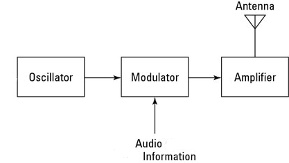 Slika 40.31 Televizijski oddajnik. Video signal iz video kamere se naloži na nosilni radijski val. Doda se mu avdio signal iz mikrofona, nakar ga antena izseva v prostor. (SlideShare)