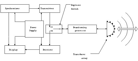 Ker so frekvence zvoka in ultrazvoka mnogo nižje od radijskih frekvenc, lahko za oddajno in sprejemno vejo sonarja uporabimo kar navadne radijske komponente in ni potrebe po mikrovalovnih komponentah. Namesto antene ima sonar kupolo, v kateri so nameščeni bati. Vsak bat je povezan s piezolektričnim kristalom v kondenzatorju ali z magnetostrikcijskim jedrom v tuljavi. Nihajoče polje kondenzatorja ali tuljave povzroči nihanje bata in obratno. Kako je izsevani zvočni impulz usmerjen, je določeno s faznimi razlikami med bati. S posebno pripravo (vrtljivo ploščo na kontaktni podlagi) lahko opazovalec ročno nastavlja časovne zakasnitve oz. fazne zamike batov, to je določa smer izseva. Ploščo lahko vrti tudi elektromotor. Izmerki se rišejo na katodni zaslon in/ali na papirnat trak.