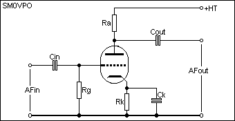 Triodni ojačevalec potrebuje za svoje delovanje tri baterije: grelno, mrežično in anodo. To ni praktično. Namesto da znižamo mrežično napetost glede na katodo, lahko zvišamo katodno napetost glede na mrežico. To naredimo z upornikom Rk v katodnem priključku: anodni tok IA gre skozenj in na njem povzroči potrebni padec napetosti RkIA. Vendar tok skozi Rk niha, kar ni dobro, ker želimo na mrežici imeti konstantno referentno napetost. Zato vzporedno k Rk vključimo še kondenzator Ck z visoko kapaciteto (in zato nizko kapacitivno upornostjo), ki nihajočo komponento toka "kratkostično" speljuje mimo upornika. Preostali dve bateriji – anodno in grelno – pa lahko nadomestimo z odcepi iz ustreznega usmernika.