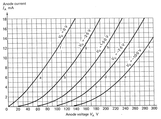Odvisnost anodnega toka od anodne napetosti – pri izbrani vrednosti žarilnega toka in pri različnih vrednostih mrežične napetosti – izmerimo z ampermetrom in voltmetrom. Pri mrežični napetosti 0 V se trioda kaže kot dioda s pripadajočo tokovno krivuljo. Čim bolj negativna je mrežična napetost, tem bolj dušena je ta tokovna krivulja.