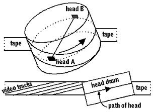 Za zapis videa v televizijski ločljivosti je potrebna frekvenčna širina okrog 5 MHz. Trak bi se zato moral gibati s hitrostjo preko deset metrov na sekundo, kar je mehansko nesprejemljivo. Zapis videa vzdolž traku zato ni mogoč. Kaj pa zapis prečno ali poševno na trak? Slednje omogoča zapisovalna glava na poševno usmerjenem vrtljivem valju. Ko se valj vrti, zapisuje glava na trak poševno sled. Vzdolž ene sledi so zapisane vse vrstice posamične slike. Še bolj praktično je, da sta na valju dve glavi; ena zapisuje sode in druga lihe vrstice slike.