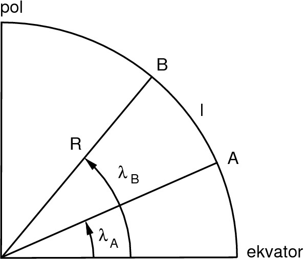 Kot, pod katerim v mislih iz središča Zemlje s polmerom R vidimo krožni lok l na poljubnem poldnevniku, je enak razliki zemljepisnih širin njegovih krajišč: l/R = Δλ. To nam omogoča, da izmerimo velikost Zemlje. V puščavi izberemo lego severnega krajišča in nato odpotujemo proti jugu za primerno razdaljo. V obeh krajiščih nato z gnomonom izmerimo zemljepisno širino ter izračunamo polmer Zemlje. Dobimo okrog 42oo aktualnih milj (po 1000 dvojnih korakov) (Eratosten).