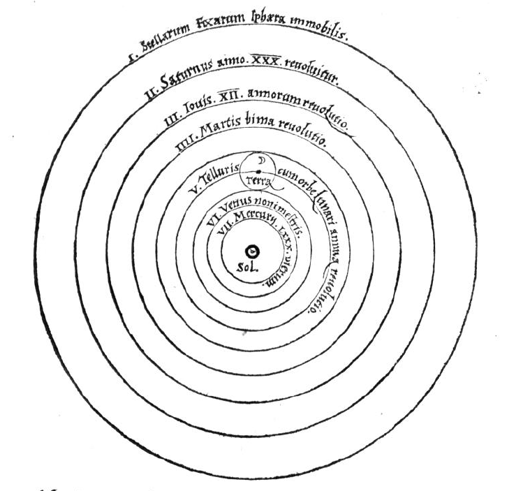 To nas vodi do nove, pravilnejše slike sveta kot sončnega sistema (Aristarh, Kopernik). V središču sveta je Sonce. Okrog njega krožijo planeti, vsi v približno isti ravnini, a pri različnih oddaljenostih. Rečemo, da zarisujejo svoje orbite. Bližnji planeti obkrožijo Sonce prej kot oddaljeni. Zemlja je tudi planet, tretji po vrsti. Sonce obkroži v enem letu. Pri tem se hkrati vrti okoli svoje osi; en zavrtljaj se kaže kot en dan. Os vrtenja ni pravokotna na ravnino kroženja, marveč nagnjena za 23,5°, in kaže vedno v isto smer med zvezde. S tem so pojasnjene deklinacije Sonca in letne dobe.