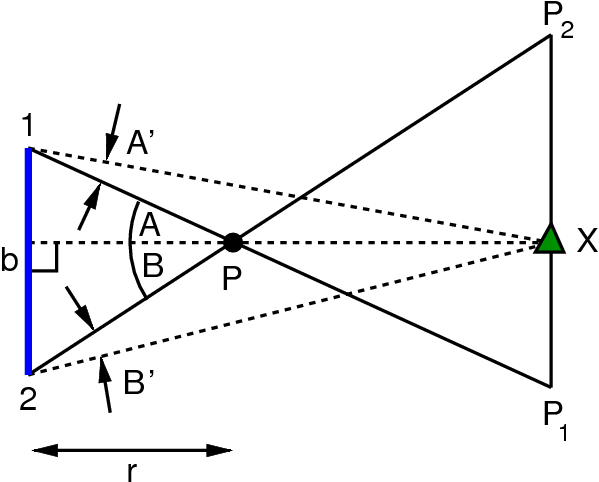 Z nekaj truda lahko osnovnico tudi izračunamo. — Kot X določimo iz vsote notranjih kotov Δλ + 2X = 180°. — Kot YA je podan preko suplementarnosti kotov X + YA + ZA = 180°. — Osnovnico b določimo iz sinusnega izreka sin X/R = sin Δλ/b. — Razdaljo IB izvemo iz sinusnega izreka sin γ/b = sin YA/IB. — Oddaljenost r pa je, končno, določena s kosinusnim izrekom r2 = IB2 + R2 + 2IBR cos ZB.