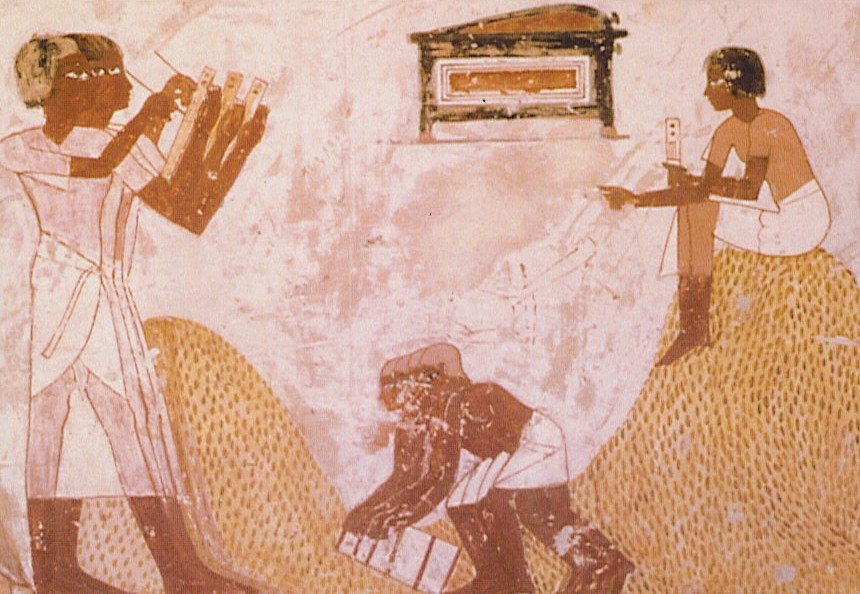 Popis žetve v Egiptu. Kmetje polnijo merske posode,
