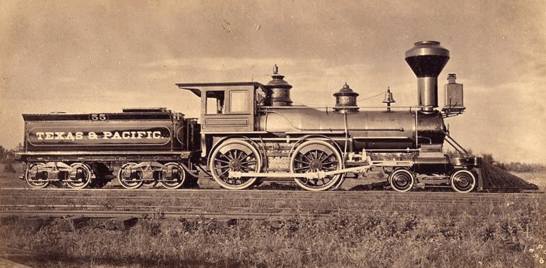 Parna lokomotiva. Priključen ima vagon s premogom. Severna